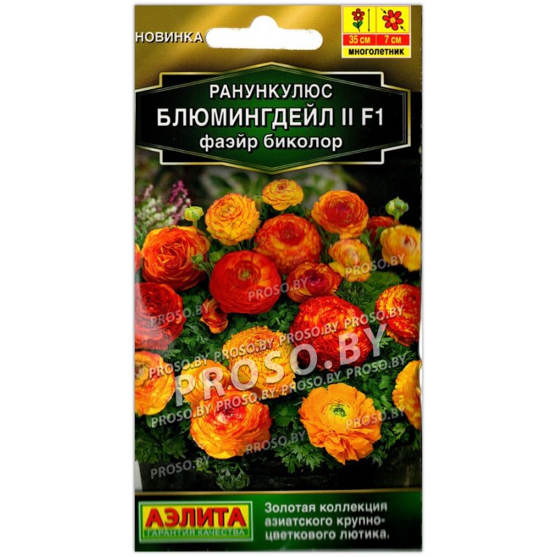 Знаменитая серия гибридов ранункулюса (азиатского лютика) «Bloomingdale II» от компании Sakata с крупными махровыми цветками диаметром 5-7 см. Главные достоинства растений – их выносливость при выращивании из семян, а также раннее и равномерное цветение, которое при соблюдении агротехники впервые начинается спустя 20-22 недели после посева. Этот корневищный многолетник в средней полосе лучше растет в горшечной культуре в комнате и оранжерее, в теплое время года выращивается на балконе и в саду. Формирует густые и приземистые кустики с резными листьями, высотой до 25-35 см (в горшках – до 20 см), шириной около 20-30 см. В цветниках к осени 1-го года жизни растения образуют корнеклубни, их выкапывают, просушивают и хранят при температуре 4-6 °С до майской высадки в грунт.