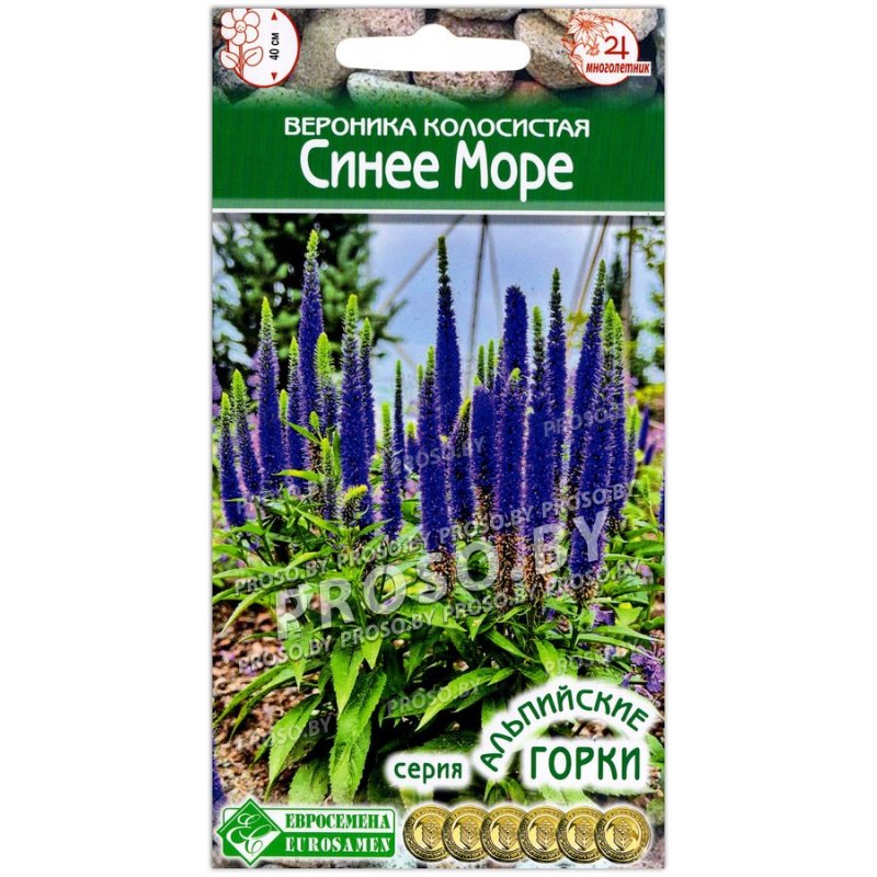 Вероника колосистая, известная также как вероника колосковая — травянистый многолетник семейства Подорожниковые, растение лесных, степных и предгорных природных зон, расселяющаяся на солнечных и сухих местах. В естественной среде обитает почти на всей территории Евразии. Благодаря декоративным качествам растение привлекло внимание цветоводов. Уже с середины XVI века его стали выращивать в садах, а селекционеры начали работать над выведением новых сортов. »Синее Море» - растение с соцветиями, поднимающимися на прочных стеблях облиственных кустиков. В период цветения оно образует заостренные колосовидные соцветия, состоящие из крошечных звездчатых цветков фиолетово-синего оттенка, похожих на колокольчики. Благодаря длинным выступающим тычинкам, соцветия выглядят пушистыми. Листья узкие и имеют форму копья со слегка зазубренными краями. Это отличный выбор для высадки в контейнеры, альпинарии и задние планы цветников, хорошо сочетается с лилейниками, ирисами или хостами.