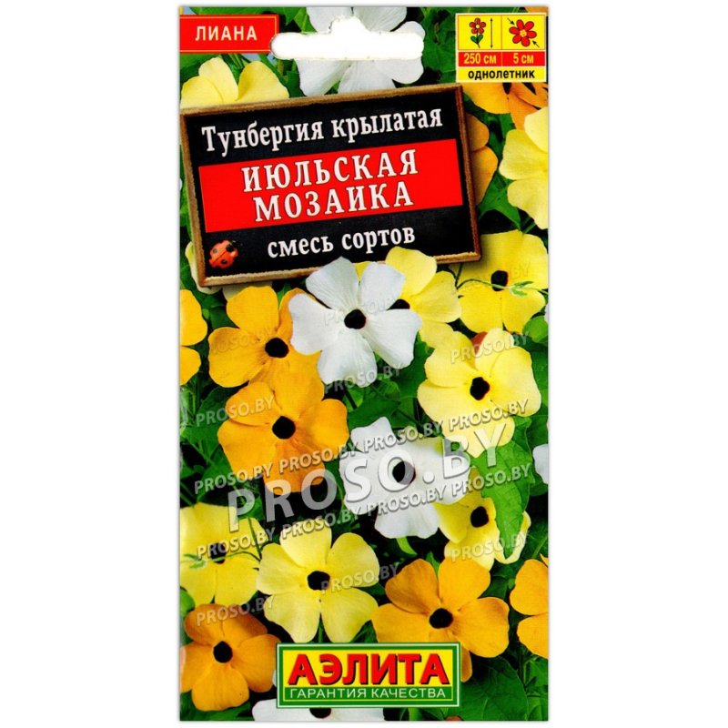 Неприхотливая однолетняя лиана. Известна среди цветоводов как «черноглазая Сюзанна». Побеги длиной 2-2,5 м густо покрыты сердцевидной листвой. Цветение обильное. Цветки Ø 4-5 см с черным «глазком» очень нарядно смотрятся на плотном экране листвы. Растение рекомендуется для вертикального оформления стен, выращивания в контейнерах и зимних садах. Красиво смотрится в подвесных кашпо: без опоры побеги опускаются вниз. Основные требования тунбергии – солнечное место, обильный полив, регулярные подкормки полным минеральным удобрением и своевременные обработки от паутинного клеща.