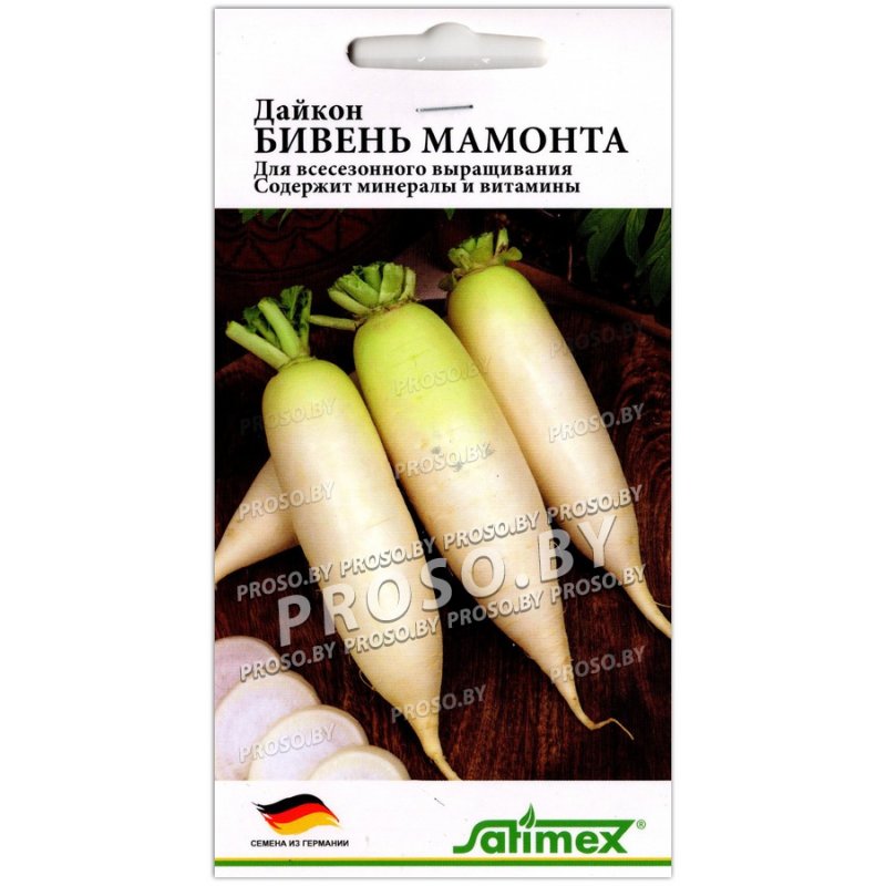 Дайкон «Бивень мамонта» является сортом позднего созревания, от начала всходов растения до созревания корнеплодов проходит от 65 до 75 дней. Сорт для всесезонного выращивания. Отличительная особенность в том, что сорт не поддается цветению, хорошая переносимость жаркой погоды, продолжительное время хранения от двух до трех месяцев, с отличными товарными качествами. Корнеплоды удлиненно-цилиндрические, белые, со слегка широковатой поверхностью, массой 700-800 г. Мякоть белая, плотная, сочная, сладко-острого вкуса. Урожайность 8-10 кг/м². Содержит много калия, кальция, клетчатки, пектиновых веществ, витамин С и ферменты. Очищает организм от шлаков, применяется в качестве бактерицидного и лечебного средства при заболеваниях печени, желчного пузыря и при простуде, растворяет желчные камни. Употребляется в натуральном виде, возможно, солить и мариновать.