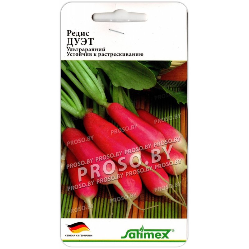 Селекция немецкой компании Satimex Quedlinburg HmbН, Германия. Ультраранний и высокоурожайный современный сорт (22-27 дней). Корнеплод цилиндрической формы (массой 25-30 г), двухцветный, красно-розовой окраски с белым кончиком. Мякоть белая, сочная и хрустящая, без горечи. Дегустационная оценка 5,0 баллов. Сорт устойчив к растрескиванию, не идет в стрелки. Прекрасно себя чувствует в закрытом и открытом грунте. Этот сорт редиса, пригоден также для выращивания в ящиках и горшках на подоконнике. Хорошо хранится в течение длительного периода, не дряблеет. Выход товарной продукции 95,8%. Средняя урожайность составляет 1,3 кг/м.кв.