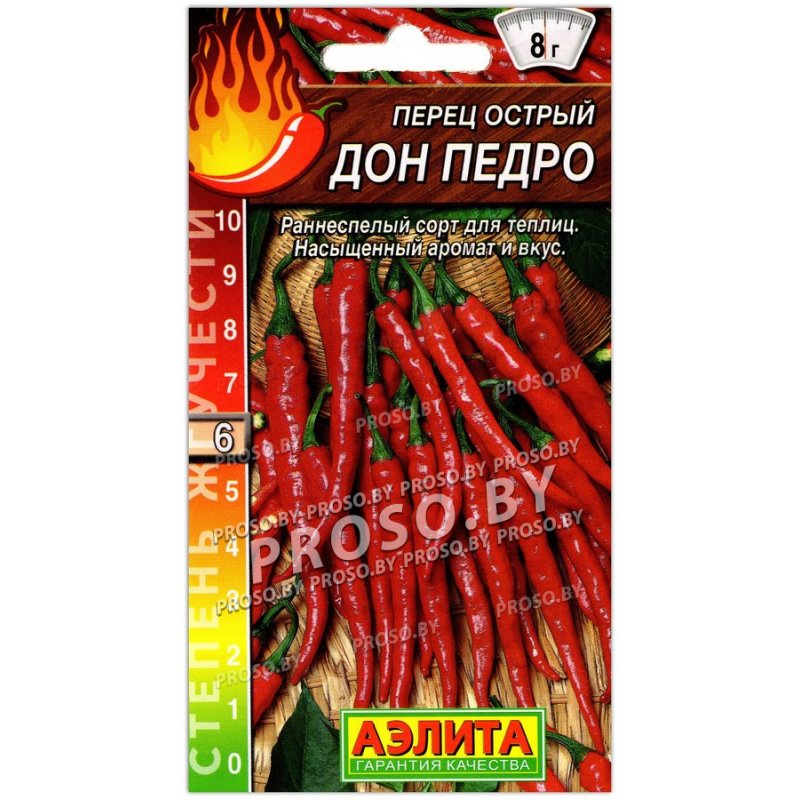 Вкусная жгучая новинка для ценителей острого перца. Раннеспелый (115-122 дня от всходов) урожайный сорт отлично подходит для защищенного грунта. В теплице растение формирует крепкий и плотный куст высотой около 1 м. Перчинки в процессе созревания из темно-зеленых становятся красными. Масса плодов 6-8 г, длина 12-15 см. Степень их остроты соответствует 6-й группе по упрощенной шкале Сковилла. Используются в свежем виде для приготовления пряных соусов и закусок, в сушеном – для специй, в маринованном – для заготовок на зиму.