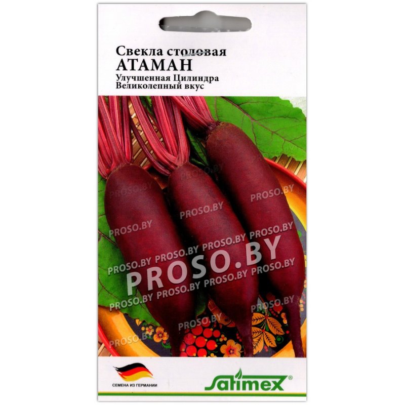 Столовая свекла, которая отличается сладостью, сочностью и долгим периодом хранения. Улучшенный сорт Цилиндра! Разработкой этого сорта занималась Satimex Quedlinburg Handelsgen mbH (Германия). Свекла Атаман имеет высокую урожайность, а также отличную товарность. Сорт стойко переносит стеблевание (цветушность). Преимуществом сорта можно считать его отличную лежкость, может пролежать до весны. По мере хранения у данного сорта свёклы растёт сладость. Корнеплоды свеклы Атаман вырастают в короткий срок на это уйдёт 110-120 дней. Корнеплоды имеют цилиндрическую форму с округлой головкой и яркий тёмно-вишневый цвет. Размер корнеплода небольшой: длина 10-15 см, а диаметр 6-9 см. Масса одного корнеплода колеблется от 250 до 300 граммов. Поверхность гладкая, а цвет мякоти тёмно-красный. Мякоть свеклы сочная и нежная, без кольцеватости. Вкусовые качества сорта отличные. Доля сухих веществ от 11,1 до 12,8%, сахара от 7,6 до 9,7%. Из плодов получаются идеальные винегреты, борщи и разные домашние заготовки.