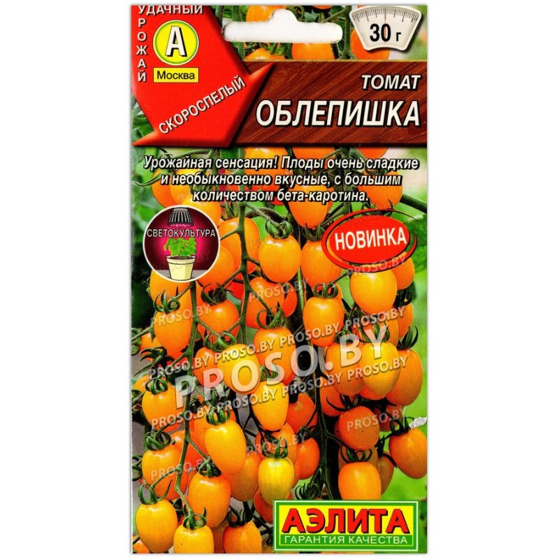 Суперурожайный сорт томата-черри с большим содержанием сахара и бета-каротина. Предназначен для выращивания в теплицах. Скороспелый, от входов до начала плодоношения 90-95 дней. Растения индетерминантные, высотой 1,8-2 м (в З/Г). Плоды* округло-овальные, желто-оранжевые, собраны в кисти по 18-20 шт, массой 20-30 г. Томаты необыкновенно вкусные, сладкие и ароматные. Убирать их можно как отдельно, так и целыми кистями. Отличный деликатес для всей семьи! Прекрасный выбор для приготовления салатов, украшения блюд и канапе. Сорт отличается высокой устойчивостью к фузариозному увяданию и фитофторозу. Урожайность в теплице 12-14 кг/м 2. *Форма плодов может меняться в зависимости от условий.