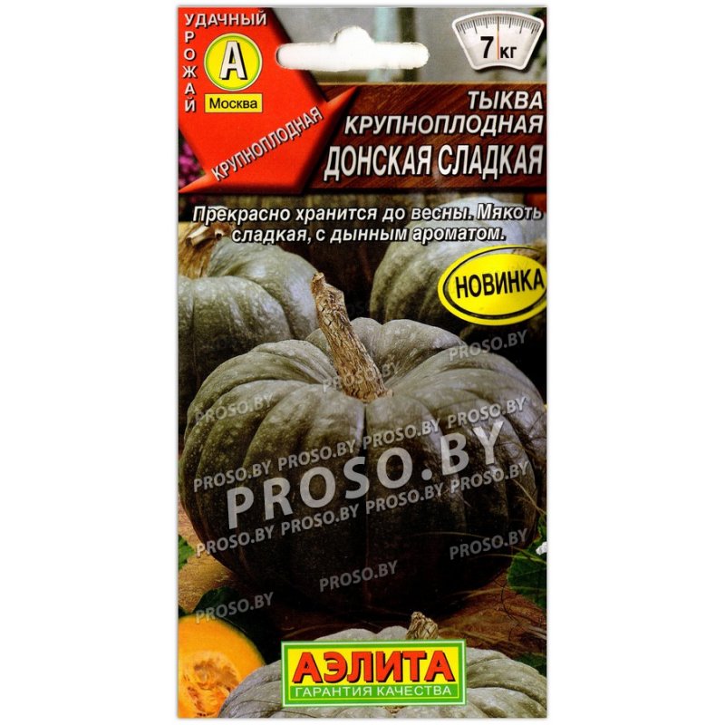 Крупноплодный засухоустойчивый сорт с невероятно вкусной мякотью. К сбору урожая приступают на 110-135 день после всходов. Растения мощные, средне-длинноплетистые. Плоды в среднем 5-7 кг, некоторые могут вырастать до 12 кг. Мякоть толстая, плотная, сочная, с повышенным содержанием сахаров и каротина. Она идеальна для приготовления соков, пюре, выпечки и раз личных горячих блюд. Подходит для замораживания. Сорт устойчив к антракнозу, среднеустойчив к мучнистой росе. Отлично транспортируется и долго хранится.