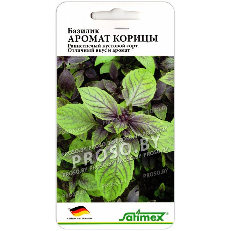Раннеспелый, урожайный сорт с ярко выраженным коричным ароматом и оливково-зелёными листьями с пурпурными прожилками, который подходит для выращивания в открытом грунте и на подоконнике круглый год. Сорт неприхотлив, любит солнце и тепло, не переносит заморозков, даёт первые листочки через 28–30 дней после всходов и ценится за витамины, масла и универсальность в кулинарии, а также высокую декоративность. Выпускает красивые сиреневые или ярко-фиолетовые соцветия, что делает его подходящим для украшения клумб и выращивания в горшках дома. Сорт ценится за высокую однородность растений и стабильное развитие независимо от условий выращивания. Урожайный сорт, с компактным кустом (50–60 см), оливково-зелёными листьями с пурпурными прожилками и стеблями. Обладает выраженным сладковатым ароматом корицы с лёгкими нотками мяты. Вкус мягкий, без резкой остроты. Применяют в свежем и сушёном виде в салатах, горячих блюдах, для консервирования. Идеален для выпечки, десертов, фруктовых салатов, маринадов и приготовления ароматного чая. Урожайность достаточно высокая (2,8–3,0 кг/м²).