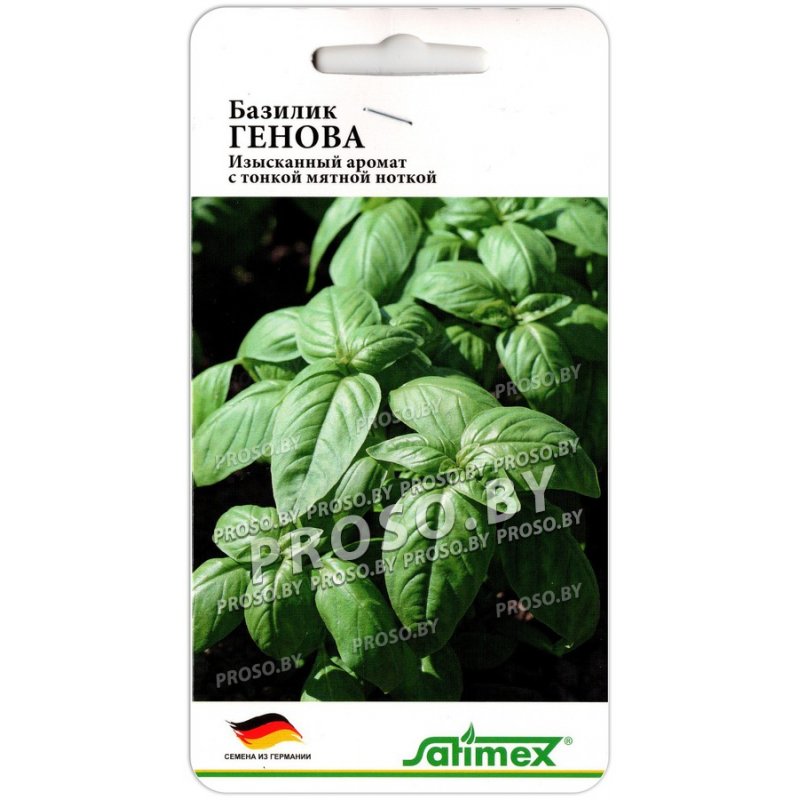 Сорт родом с северо-западного побережья Италии, из портового города Генуя, в честь которого и получил своё название. Сорт легко выращивать, он хорошо адаптируется к различным условиям. Базилик Генова это среднеранний (40-45 дней), зеленолистный сорт с пикантным вкусом и сильным ароматом, подходящий для выращивания в открытом грунте и теплицах. Растение достигает высоты около 50 см, имеет ярко-зеленые, гладкие, глянцевые листья. Вкус пикантный, оригинальный, приятный. Аромат изысканный, сильный, с тонкой мятной ноткой. Его используют свежим и сушеным в кулинарии как приправу к различным блюдам. Подходит для салатов, соусов, пасты, песто, а также к мясу, рыбе и творогу.